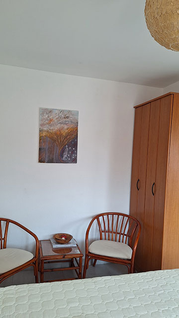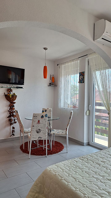 Površina apartmana je 33 m2 i namenjen je za smeštaj 2+ osobe. Čini ga velika soba sa francuskim ležajem, manja soba sa ležajem, kupatilo sa tuš kabinom, kuhinja, trpezarija i terasa.